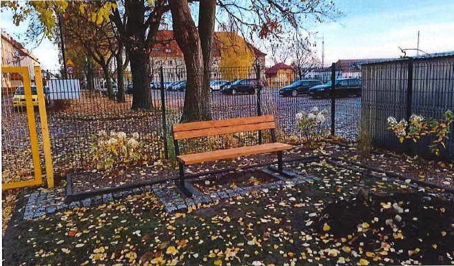 Z prawej strony budynku, na terenie zielonego placu, w jego przedniej części, gdzie zostanie posadzony klon ze środków własnych, pojawią się nowe półokrągłe drewniane ławeczki - 2 szt. Wzdłuż płotu, graniczącego z sąsiednim budynkiem, zostanie posadzony żywopłot z forsycji o długości 25 m.